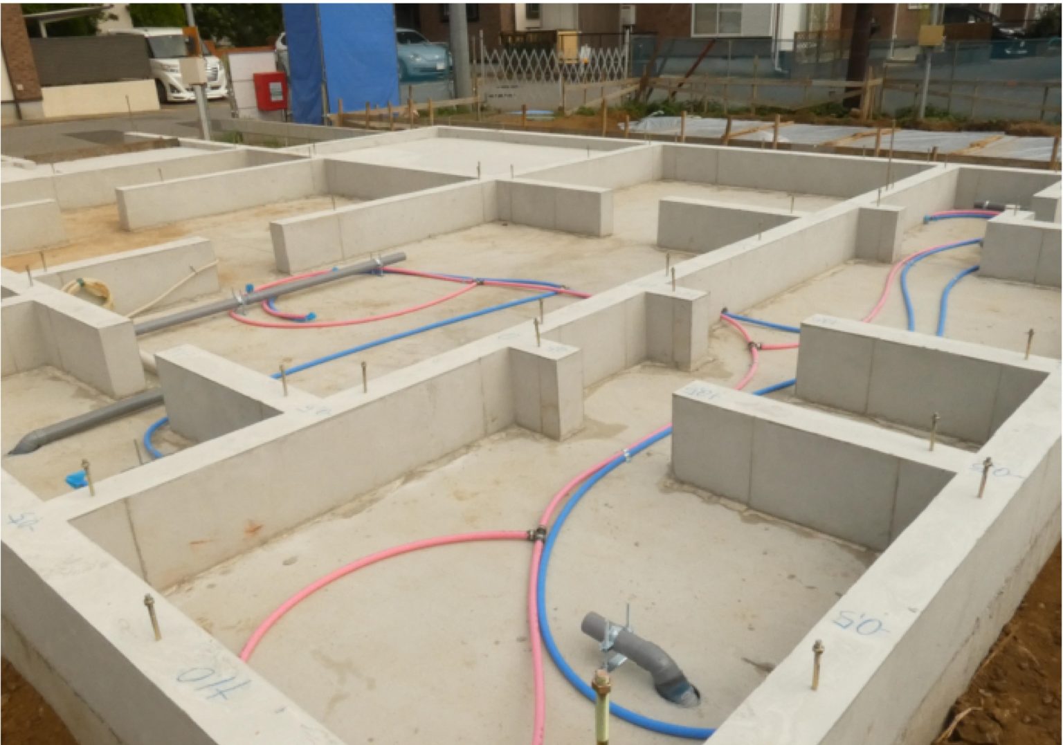 緑が丘 S様邸「水道配管完了」緑が丘にて建築中のS様邸の進捗状況です☆ (基礎工事)べた基礎です。立ち上がりのコンクロート部分も綺麗に出来上がっています。 水道配管も完了のようです。 青色が水、ピンク色がお湯が通る管ですね。(色で分けるって、やっぱり分かりやす~い♪) …