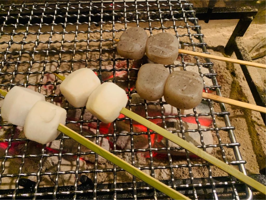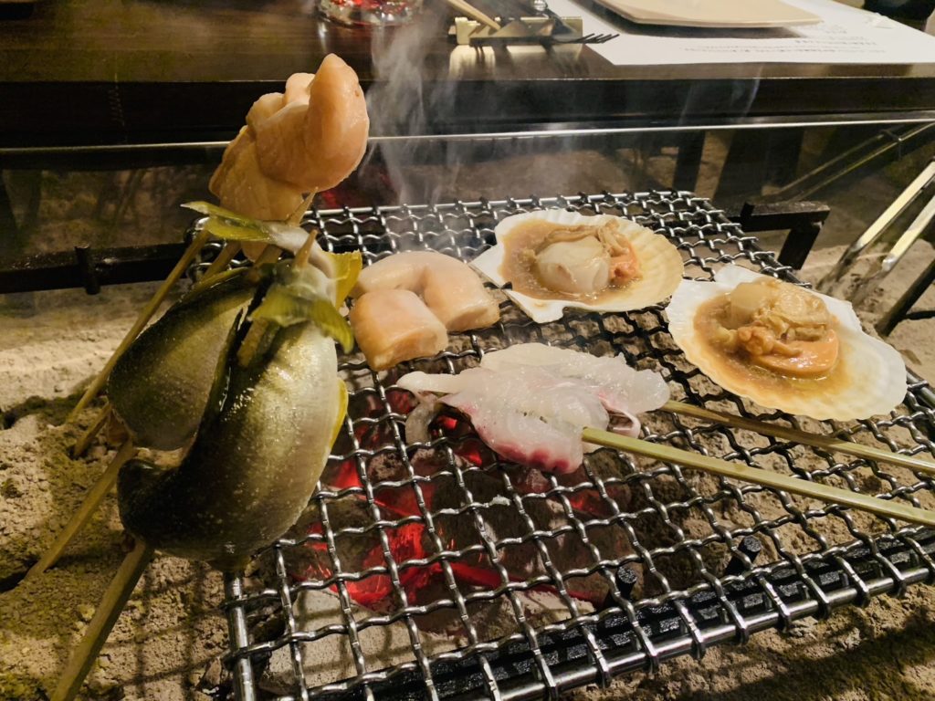 店内は落ち着いた照明と、囲炉裏の火が心地よく、リラックスできる空間です。カウンター席もあって、目の前で料理を焼く様子を楽しむことができ、臨場感も抜群でした。