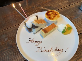 食事は一品一品が本当に美味しく、特に「牛乳の本当の美味しさを知ってもらいたい」というお店のこだわりが料理に反映されているのを感じました。デザートには、突然のサプライズでバースデーケーキをいただき、旦那さんも少し照れた様子で、素敵な思い出となりました。